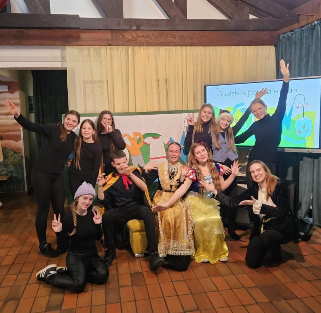 Skupni scenski nastup “Snjeguljica i sedam patuljaka” prikazala je dramska skupina naše škole koju čine Iris Koljaj, Eva Vrček, Stela Šabić, Marta Crnoja, Franka Maslać iz 6. razreda; Ana Vnučec iz 7.razreda; Petra Vojvoda, Magdalena Miletović, Franka Kanjuh i Jakov Kaurin iz 8.razreda, a za nastup ih je pripremila mentorica Snježana Vlahović Perić.