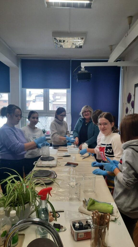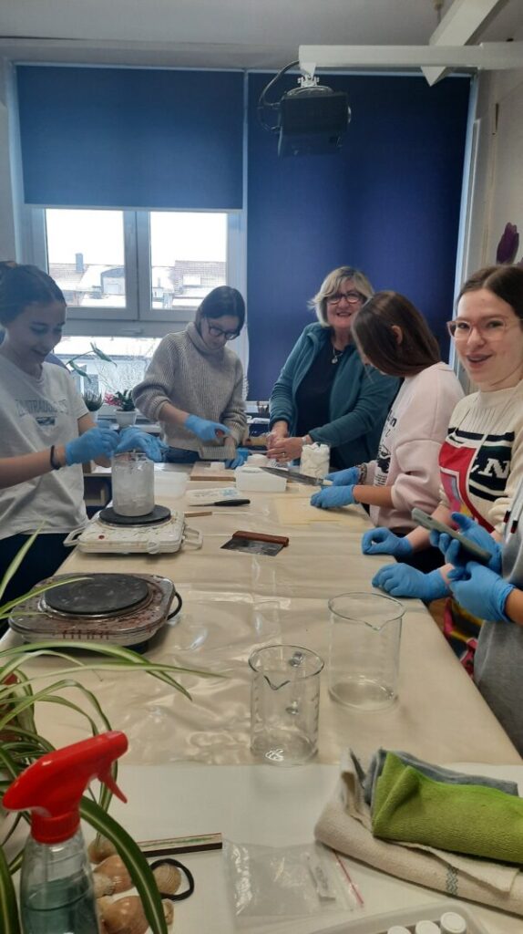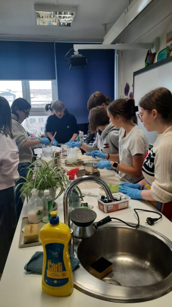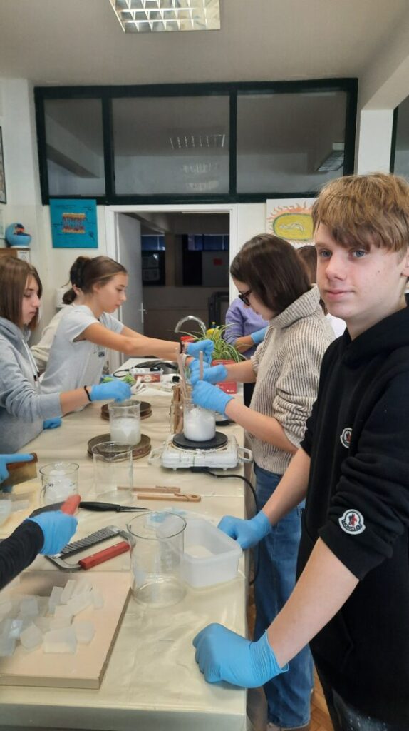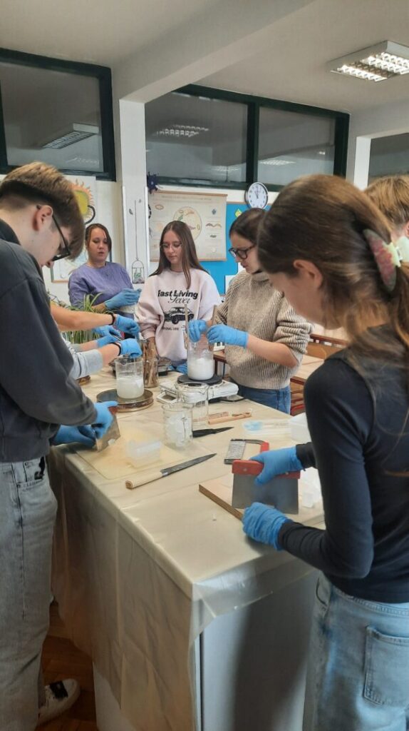 Desetak učenika 7. i 8. razreda sudjelovalo je 21. studenoga na radionici izrade sapuna koju su vodile Ana Marija Munjas i Dubravka Bayer, profesorice biologije i kemije. Glavni sastojak sapuna koji su učenici izrađivali bila je glicerinska baza. Nju su najprije rezali na sitnije komade, kockice, a zatim su ih u velikim laboratorijskim čašama zagrijavali i miješali. U rastaljenu bazu dodavali su točno određen broj kapi eteričnih ulja i boja. Koristili su eterična ulja jele, citronele, limete, cimeta, geranija i lavande, a od boja zelenu, crvenu i ljubičastu. Dobivenu smjesu ulili su u silikonske kalupe i ostavili da se ohladi. Ugodan miris prirodnih eteričnih ulja širio se učionicom i hodnicima škole. Kad su se sapuni stvrdnuli, učenici su ih izvadili iz kalupa i s ponosom zaključili da su im odlično uspjeli. Preostaje ih još samo lijepo zapakirati i pripremiti za prigodnu božićnu prodaju.